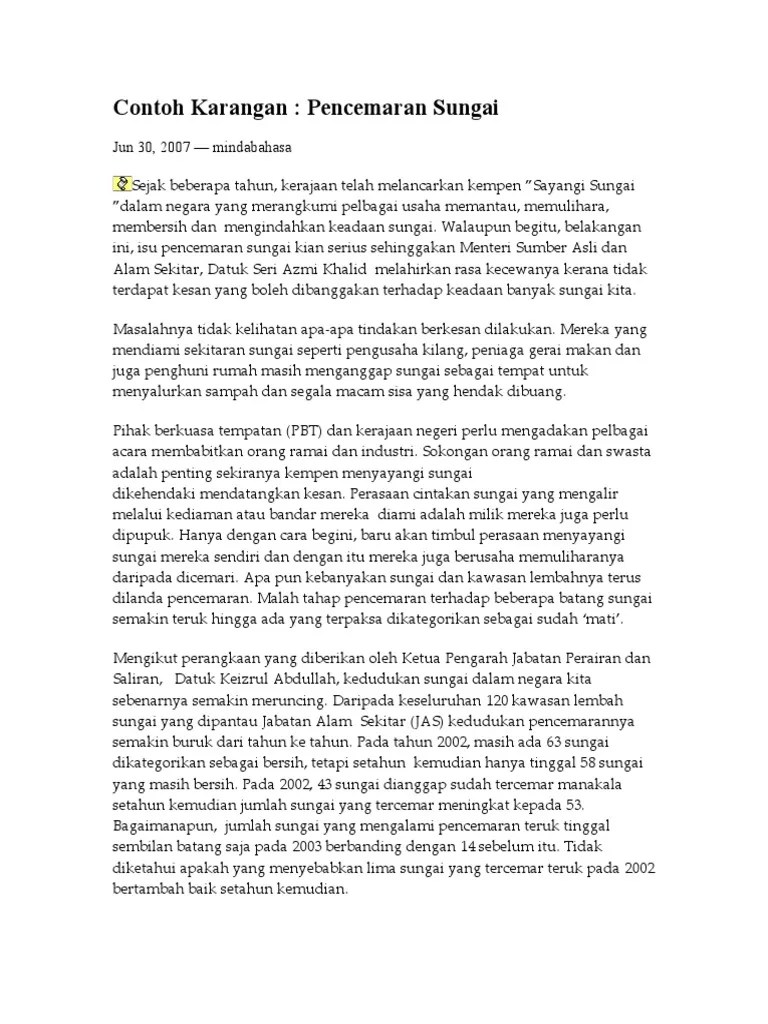 Pencemaran Air Karangan Upsr from imgv2-1-f.scribdassets.com Polemik pencemaran alam tidak lekang daripada bibir masyarakat. Dewasa ini,era permodenan menderaskan lagi pembangunan negara. Usaha untuk mengatasi pencemaran alam sekitar ini sepatutnya dimulakan daripada institusi keluarga. Pencemaran alam sekitar menyebabkan berlakunya masalah kesihatan kepada masyarakat. Tulis karangan yang bertajuk kesan pencemaran alam sekitar. Sekiranya masalah ini tidak diatasi, sudah pasti dunia kita akan mengalami kemusnahan yang lebih teruk. Pencemaran udara menyebabkan manusia bernafas dalam udara yang tidak bersih dan terdedah kepada penyakit berbahaya seperti asma. Isu kehendak 1 kehendak 2 kata kunci isu :